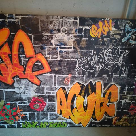 Spraymaalilla tehty taideteos, Kansainvälisillä suurmarkkinoilla ollut taiteilija tämän valmistanut. Mukaan tulee musta kehys.