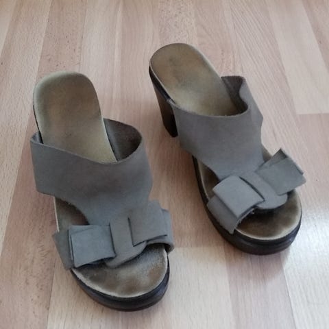 Caloun nahkaiset sandaalit koko 37. Vaaleanvihreä nahkakenkä, remmit tulevat kauniisti jalan päältä ristiin. Mukavat jalassa, pohja on pehmeä, kumimainen "puukenkä".