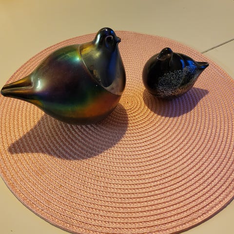 Kotimaista käsityötä lasilinnut. Erilliskuvassa olevan linnun pyrstö liimattu.