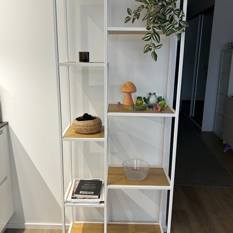 Siisti, ehjä, Jyskistä ostettu Trappedal- hylly. Mitat 109x70x30cm. Kaikki osat tallessa ja helposti kannettavissa kassissa ja nippusiteillä. Minigrip-pussissa ruuvit. Nouto Tuirasta.