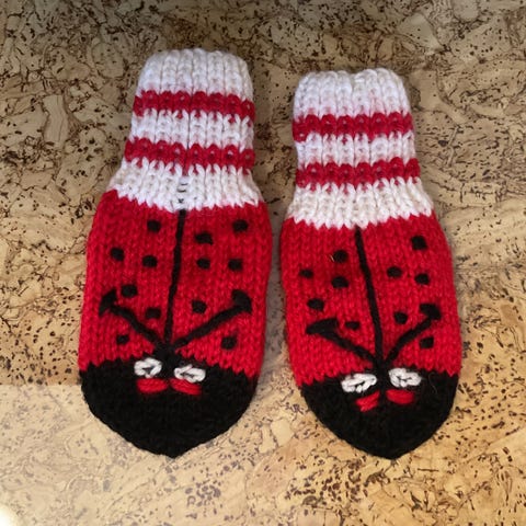 Leppäkerttu tumput neulotut pituus 20 cm ja leveys 10 cm
