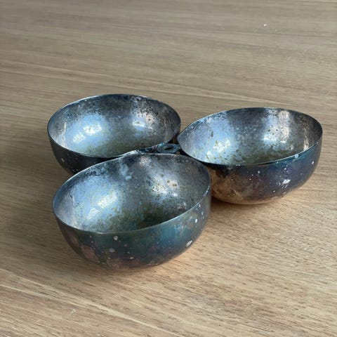 kaunis kaksiosainen tarjoiluastia jossa jalallinen metallirunko ja lasikulho rungon sisällä. Lasikulho voidaan irrottaa. Made in England. Hyväkuntoinen, täysin ehjä. Alaosa metallia ja sisäosa lasia. Hinta 7e. Nouto