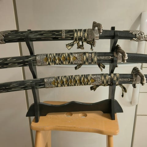 Auto Japanilainen samurai miekka mustalla tuppea. Miekassa näkyy terä, joka on kiinnitetty mustaan tupen osaan. Sopii koriste- tai harrastuskäyttöön. Tododella terävässä kunnossa. Terotin mukaan