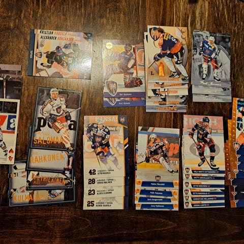 47kpl Sisun, Cardsetin ja Bluelinen valmistamia jääkiekkokortteja. Ei tuplia eikä triploja.. Korttien kunto pääasiassa hyvä/erinomainen.