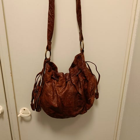 Viininpunainen "matala" olkalaukku, nahkaa