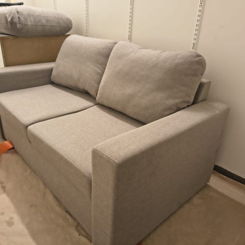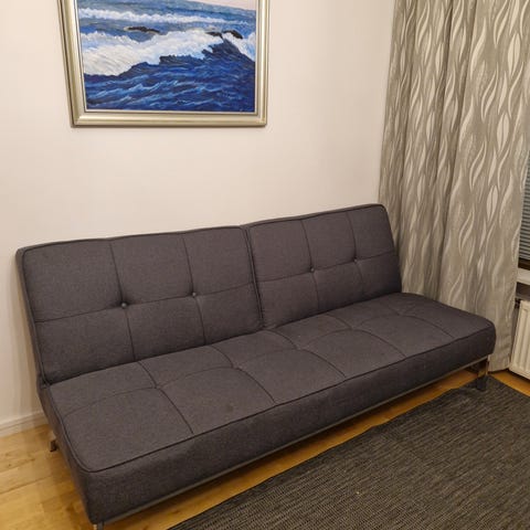 Harmaa kangaspäällysteinen sohva, jossa on selkänojassa pehmuste ja yksinkertainen muotoilu. Sohva soveltuu olohuoneeseen tai muuhun ,,alaosassa vuodevaatetila ,soveltuu oleskelutilaan.leveys:vuoteena:120cm, virheetön kunto. alennettu hinta.