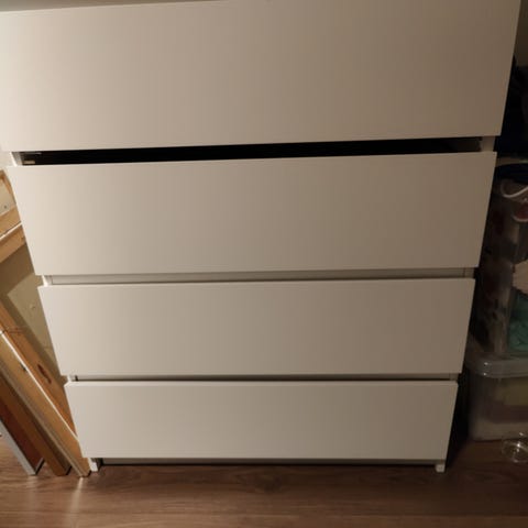 Annetaan hieman elämää nähnyt lipasto uuteen kotiin. Lipston päällä ollut alunperin matelijan terraario, jonka myötä kanteen on sattunut ajan saatossa pari vesivahinkoa ja on parista kohtaa kuprulla. Nämä eivät kuitenkaan erotu kauemmaksi. Muuten mielestäni ihan hyvässä kunnossa ja on tukeva lipasto. Laatikot ehjiä ja aukeavat kuten pitää. Mukaan tulee myös seinäkiinnikkeet.