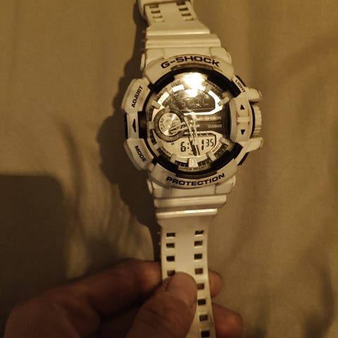 Hieman normaalia pienempi g-shock. Erinomaisessa kunnossa, mukaan pelkästään kello. Sopii kapeampaan ranteeseen.