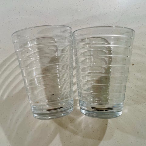 Toinen laseista on hyväkuntoinen. Toisessa on aivan pieni halkeama reunassa, joka on huomioitu hinnassa ja näkyy kuvissa (ks. kuva 4). Halkeama on pieni eikä vaikuta käyttöön, mutta mainitsen sen varmuuden vuoksi.