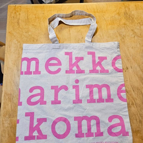 Käyttämätön Marimekko logo kangaskassi punaisilla kukilla.