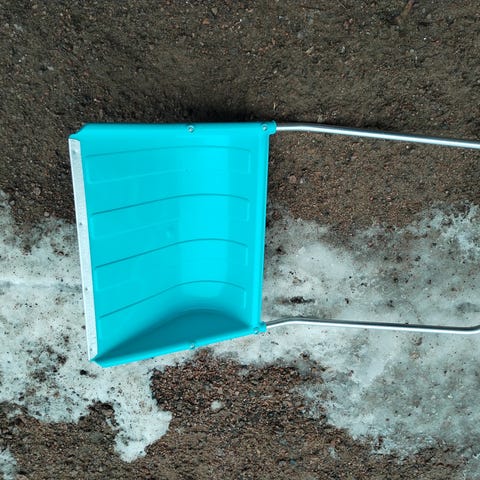 Vaaleanpunainen lasten lumikola ja punainen pikkuliukuri. Liukurissa enemmän käytön jälkiä.