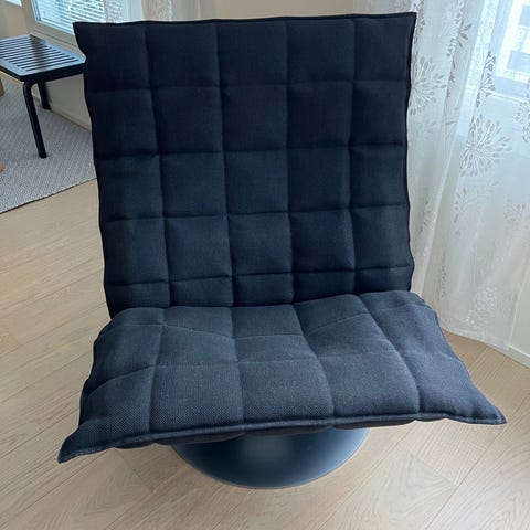 Hyväkuntoinen kapea Woodnotesin Harri Koskisen suunnittelema K-tuoli ja rahi laippajalalla. Väri Stone/black eli musta pohja vaalea pinta. Kangas hyvässä kunnossa, laippajalassa näkyvissä pinnassa pieniä käytön jälkiä. Noudettavissa Etu-Töölössä.