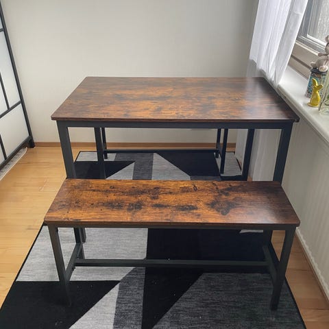 Myydään muuton tieltä uudenveroinen ruokailuryhmä, johon kuuluu 2 pientä pöytää ja 2 tuolia. Pöytiä voidaan käyttää erillisinä pöytinä, vastakkain 2h ruokapöytänä, tai kapeana baari-/työ-/sivupöytänä kätevästi tarpeen mukaan. Loistava pieneen tilaan. Tuolien jaloissa huopatassut.