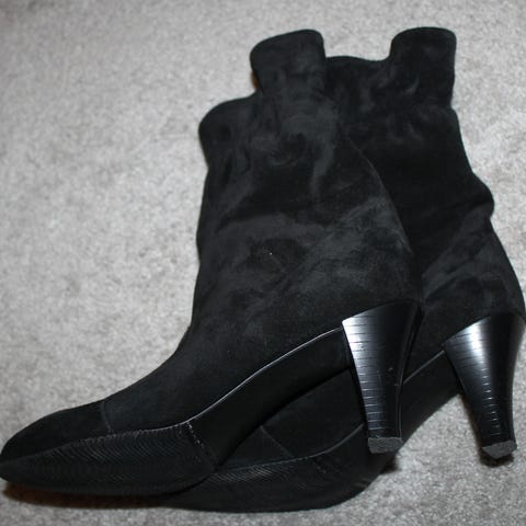 Nämä tummanruskeat Peter Palmroth -saappaat on valmistettu pehmeästä mokkanahasta, ja niissä on matala kantapää sekä kapea kärki. Varressa, takaosassa, on lisänä strukturoitu nahkapaneeli, joka tuo asuun hienostunutta yksityiskohtaa. Saappaat ovat pitkävartiset.Koko EUR 38 / 4 1/2 (CM 25.6)Valmistaja: PETER PALMROTHVäri: tummanruskeaMateriaali: mokkanahka ja nahka