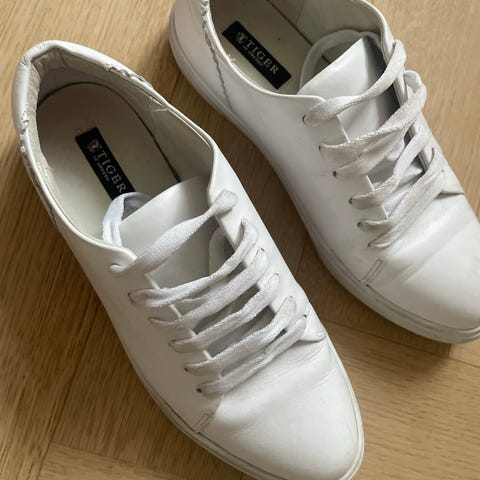 Nämä Tiger of Swedenin tennarit on valmistettu valkoisesta nahasta ja niissä on nauhakiinnitys. Kengille ominainen piirre on paksu, rouhea kumipohja, joka luo niihin modernin ja paksun ulkonäön. Kantapäässä on pieni tummansininen vetolenkki.Koko 36. Pohjissa näkyvää käyttöön liittyvää likaa ja kulumajälkiä.Valmistaja: TIGER OF SWEDENVäri: valkoinen/luonnonvalkoinenMateriaali: nahka, kumi