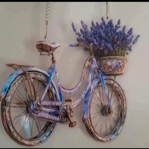 Ihana roikkuva polkupyörä koriste-esine kukkasilla. Koko n. 18x18.