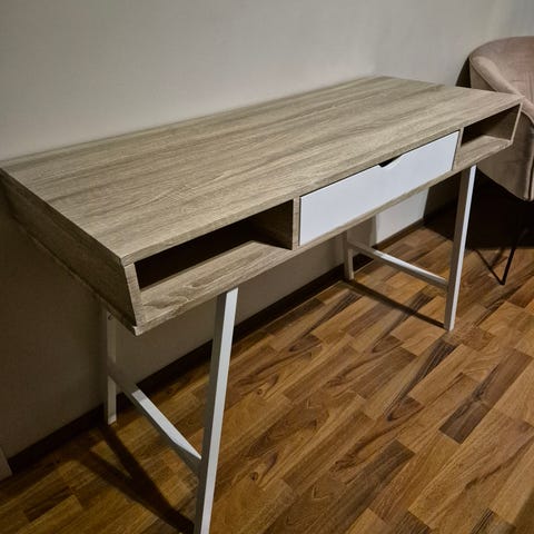 Jysk työpöytä, jossa avohyllyt. Väri musta. Soveltuu työskentelyyn ja säilytykseen.