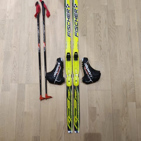 Madhus sukset 130 cm, exel sauvat 105 cm ja fischer monot koko 33.
