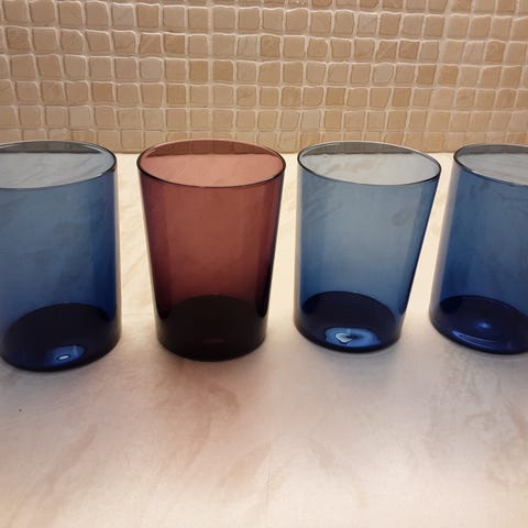 Kuusi kappaletta Iittalan sinisiä ohuita laseja.