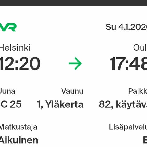 VR junalippu Helsinki - Oulu matkalle 15. helmikuuta 2026 kuvan mukaiseen lähtöön. Yksittäinen lisämaksullinen paikka, huom opiskelijalippu.