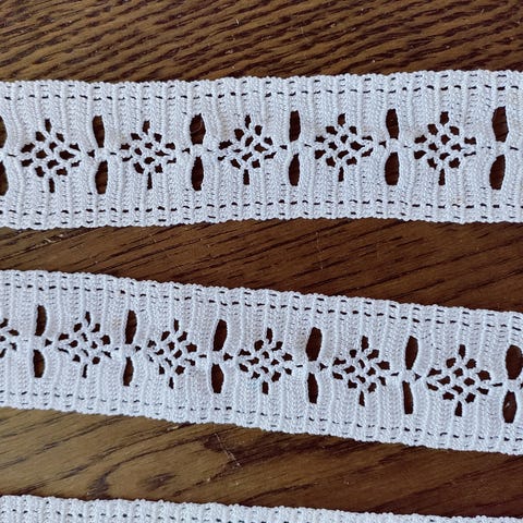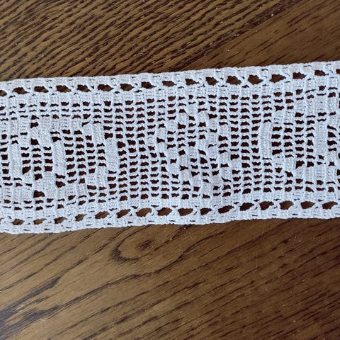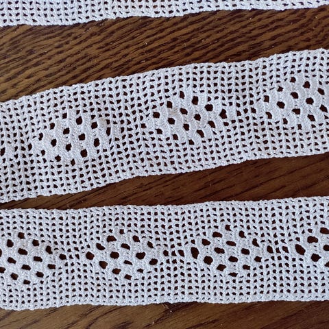 Kaksi pehmeästä langasta käsinvirkattua pitsiä. Pituudet n. 77 cm ja leveydet n. 4 cm.