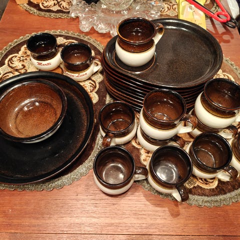 Sydänvuoka, mukit 8 kpl, säilytyspurkit 2kpl. Yhdessä mukissa pieni rikko reunassa (siitä kuva).