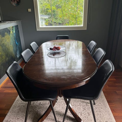 Uutta vastaava tummanruskea ruokailuryhmä, tukeva ja painava. Kuusi tuolia, jossa irroitettavat istuinosat. Halutessaan voi vaihtaa kankaan.
