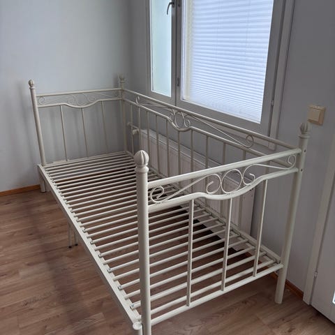 2-istuttava sohva kangasta. Muunnettavissa helposti sängyksi. Istuin- ja selkätyynyt vaahtomuovia. Makuuala 126x195 cm. L160 x K78 x S69 cm. Siistissä kunnossa.