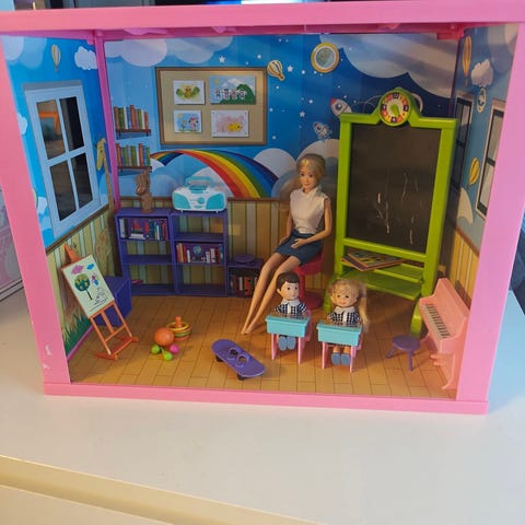 Barbie nukketalo, jossa on kaksi kerrosta ja erilaisia huoneita. Sisältää kalusteita.