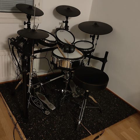 Settiin olen ite ostanut lisäsymbaalin nimeltä Roland CY-13R. Kaikki tässä setissä toimii kuin uudessakin.