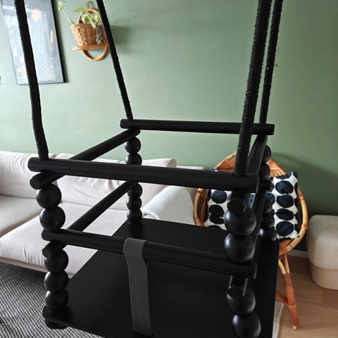 Myydään puusta ja nailonnyöristä valmistettu Done by Deer -merkkinen sisäkäyttöön tarkoitettu lasten keinu. Max paino 30 kg. Mitat 32x32x140cm.