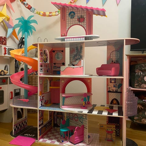 L.O.L. Surprise monikerroksinen nukkekoti sisältää useita huoneita ja kalusteita, kuten liukumäen, keittiön ja kylpyhuoneen. Nukkekoti on suunniteltu lasten leikkeihin ja se tarjoaa monipuolisia leikkimahdollisuuksia.