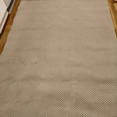 Ikean Morum matto sisä-/ulkokäyttöön. ”Jämäkkä” eli pysyy hyvin paikoillaan ja reunat alhaalla. Lipaston painauma näkyy kuvassa keskellä. Vaalea beige. Matto on ollut vaatehuoneessa, on siisti ja ehjä. Ei pesty.
