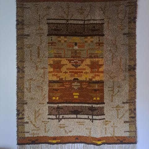 Kaunis ja raikasvärinen Kuusenkerkkä-ryijy. Suomalainen malli, mutta suunnittelijaa en tiedä. Malli lienee 60-luvulta. Mitta ilman hapsuja.