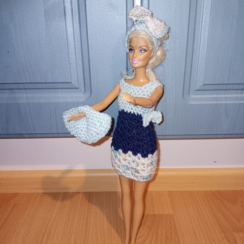 Virkattu mekko, hiuspanta, olkalaukku ja säärystimet