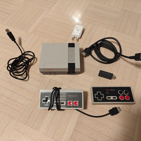 Nintendon mini konsoli, 2 ohjainta, hdmi-adapteri ja hp monitori.