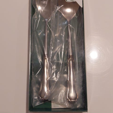 Hopeiset Suomi-sarjan salaatinottimet, pituus 26,5 cm. Muutamia kertoja käytetty, ei kaiverrusta. 250€+ posti