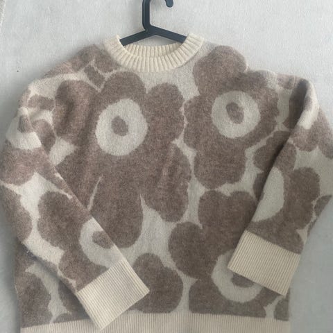Myydään hyväkuntoinen käytetty Marimekon 'Polkujen Unikko' -neule. Rento malli, halkiot sivuilla.
