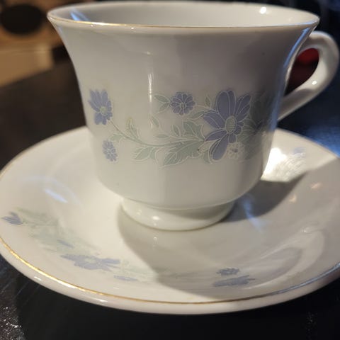 Posliinikuppi ja lautanen, joissa on kultakoristeet. Kuppi ja lautanen on valmistettu posliinista ja koristeltu yksityiskohtaisella kultakuviolla.