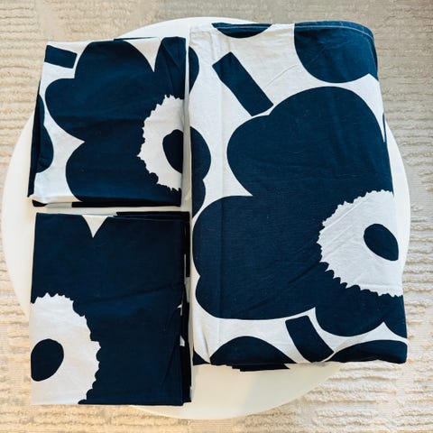 Vähän käytetty marimekon unikko tupla pussilakana sekä kaksi tyynyliinaa. Pesty ja vain muutaman kerran käytetty. Mitat 240 x 220 ja tyynyliinoilla 50 x 60. Väri tumman sininen. 87% puuvillaa ja 13% pellavaa. MMM