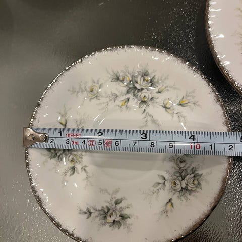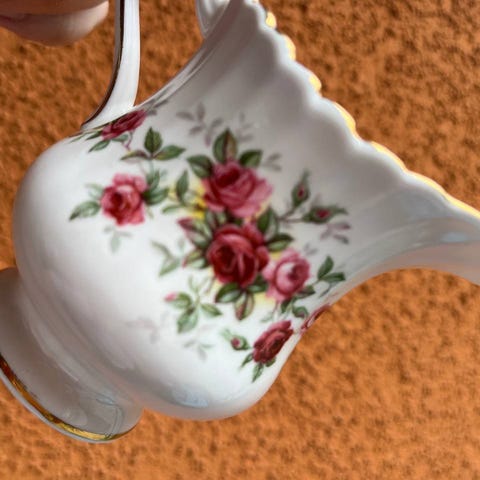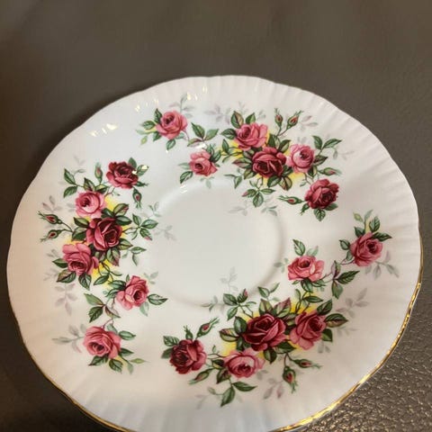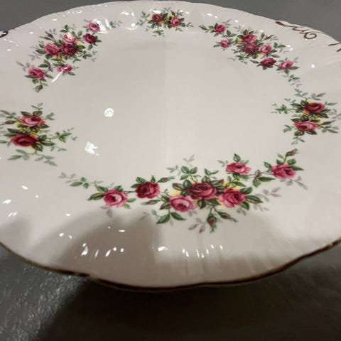 Kaunis ruusukuviointi, aaltoileva reuna ja kultaus.