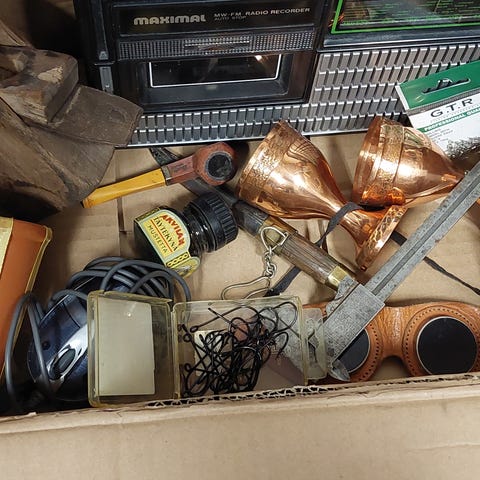 Laatikollinen sekalaista vanhaa tavaraa