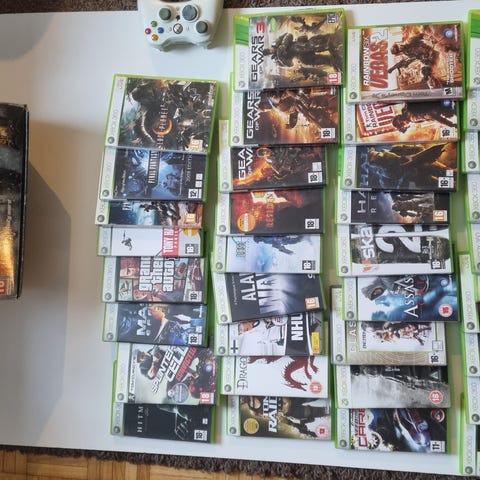 Konsoli, 4 ohjainta, liikekamera, ratti poljin ohjain ja melko läjä pelejä, muistaakseni 66 fyysistä levyä ja hp näyttö.