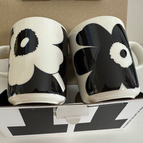 Marimekko Oiva Juhla Unikko -sarjan mukit, 2 kappaletta. Värit punainen ja valkoinen, kukkakuosi kultareukuksella.