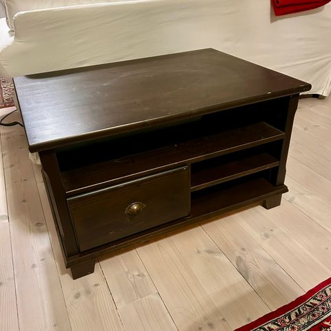 Koivuviiluinen TV-taso/syvä matala hylly, Ikea (ei enää valikoimissa). Perussiisti, käytön jälkiä. Kaksi hyllytasoa TV-tason alla. Ei reikiä pinnassa.