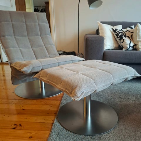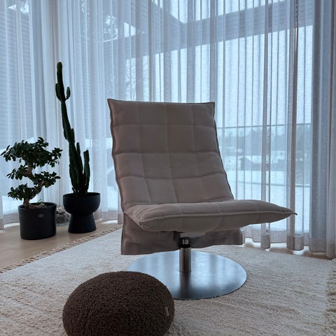 Myydään hyväkuntoinen Harri Koskisen suunnittelema K-tuoli. Musta Sand-kangas, leveä malli laippajalalla. Kangas hyvässä kunnossa. Myös jalka yleisilmeeltään hyvinkin siisti (kts. kuva), mutta tarkasti läheltä katsoen on nähtävissä pieniä käytön jälkiä.