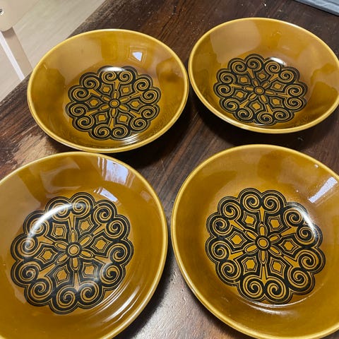 Keltaiset retro vintage Pigg-lautaset 1960-luvulta. Punaiset Helmer Rigdtrömin suunnittrlemat Ruter-lautaset, valmistettu vuosina 1957-1962. Valkohopea lautaset 12kpl Arabian Platina-sarjan lautasia, valmistettu vuosina 1957-1973. Osassa lautasista pieniä säröjä.