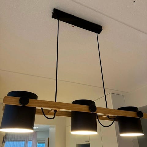 Riippuvalaisin, jossa valkoinen kangasvarjostin ja puinen kehys. Sopii sisätiloihin yleisvalaisimeksi.