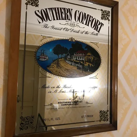 Old Bushmills Irish Whiskey peilitaulu, jossa on värillinen kuva tislaamosta ja teksti. Peilitaulun kehys on puisesta materiaalista. Mitat 40cm×49cm. Toimitus: Nouto tai postitus.