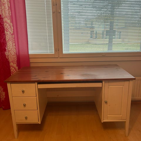 Ollut lapsella käytössä ja hyvin on mahtunut kolme kaverusta yhdessä askartelemaan. Pöydässä on kolme vetolaatikkoa, joista ylimmässä lukko. Avain on tallessa, mutta vedin on hävinnyt. Pöydän päällä irtonainen lisähyllykkö. Työpöydän sivussa vedettävä jatkopala, joka tuo hyvin lisätilaa pöydälle. Tästäpä laatukaluste pilkkahintaan näppärälle korjailijalle.
